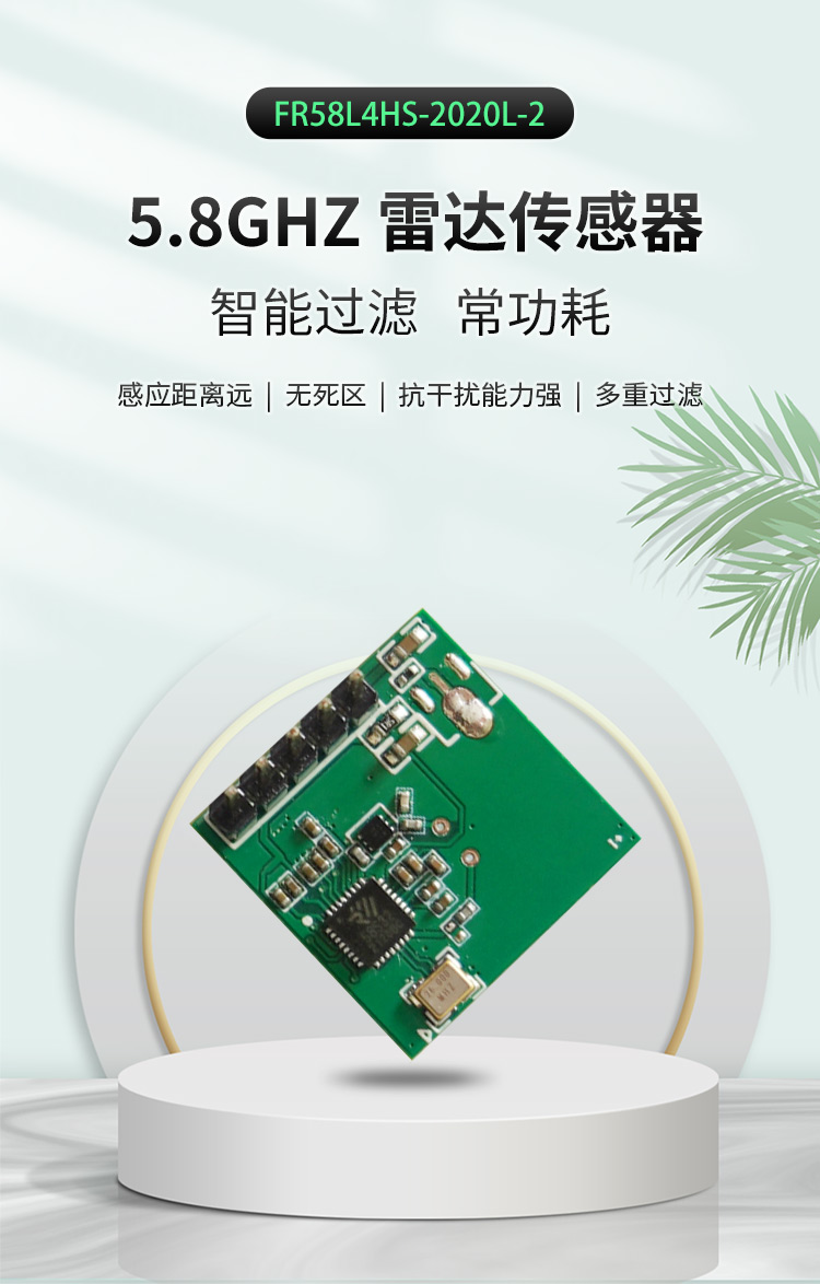 FR58L4HS-2020L 是飞睿智能推出的高性能 5.8G 雷达传感器,雷达模块利用多普勒原理,通过天线发射高频电磁波并接收初期反射波,以此判断覆盖范围内物体的移动,给出相应电信号。模块尺寸 20*20MM 该芯片集成了 5.8G 微波电路、中频放大电路以及信号处理器,集成度高且生产一致性好,模块内置 32 位 MCU 和收发天线,大大提高了传感器的感应性能。雷达模块感应距离远、角度广、无死区、透镜和透镜老化问题不受温度、湿度、气流、灰尘、噪声、亮暗等影响。模块内植入过滤雨水树叶算法,能有效过滤掉雨水树叶的误触发,广泛应用于智慧照明、智能门锁、智慧安防、智慧家电等多个领域。
