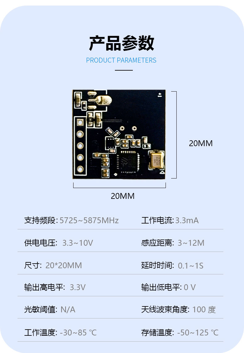 FR58L4LS-2020M-2 简称 2020M 是飞睿智能推出的高性能低功耗 5.8G 雷达传感器,雷达模块利用多普勒原理,通过天线发射高频电磁波并接收初期反射波,以此判断覆盖范围内物体的移动,给出相应电信号。模块尺寸 20*20MM,该模块集成了 5.8G 微波电路、中频放大电路以及信号处理器,集成度高且生产一致性好,模块内置32 位 MCU 和收发天线,大大提高了传感器的感应性能。雷达模块感应距离远、角度广、无死区、透镜和透镜老化问题不受温度、湿度、气流、灰尘、噪声、亮暗等影响。模块内植入滤雨树叶算法,能过滤掉雨水树叶的误触发,性能稳定,广泛应用于智慧照明、智慧安防等多个领域。